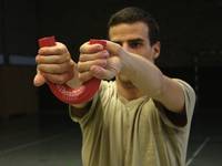 Halten Sie den Thera-Band Flex-Bar-Stab mit geraden Armen vor dem Körper, wenden Sie beide Unterarme nach außen und halten Sie diese Position 2 Sekunden, dann wenden Sie die Unterarme nach innen und halten auch diese Position 2s. Dies ist eine Wiederholung. Wiederholen Sie diese Übungen 15x, machen dann 1min Pause, dies dreimalig hintereinander (3 Sätzen), und zwar morgens und abends, so dass Sie pro Tag 6x15 Wiederholungen absolvieren.